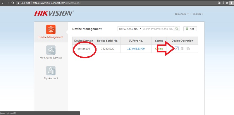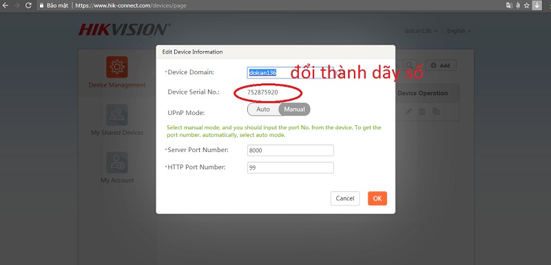 B2: Kích vào biểu tượng hình bút để sửa lại Device Domain thành dãy số Device Serial No. ở hàng bên cạnh