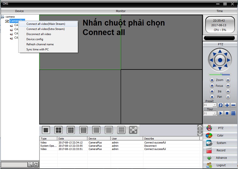 Sau đó ấn chuột phải chọn Connect all video (Main Stream)