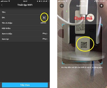 B3: Ấn vào hình vuông ở dòng SN rồi giơ vào đằng sau camera wifi C15, C35 để quét mã