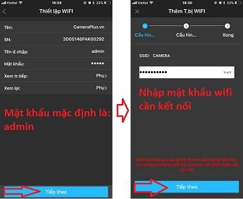 Tiếp theo các bạn nhập mật khẩu wifi nơi bạn cần kết nối cho camera c15,c35 ( điện thoại của bạn cũng phải kết nối với wifi đó trước ) rồi ấn tiếp theo