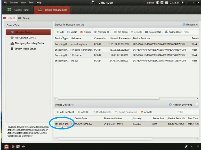 >>> Bấm vào đây để tải phần mềm xem camera Hikvision trên máy tínhTải về và cài đặt như phần mềm bình thường sau khi tải xong mở phần mềm lên và vào mục Device Management sẽ suất hiện địa chỉ IP của camera Hikvision vừa cắm