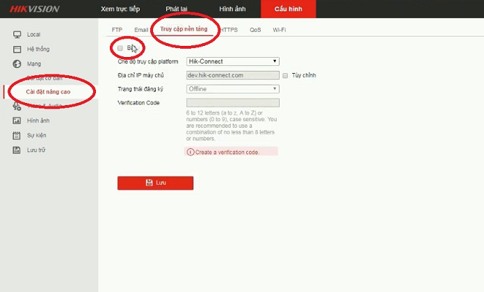 - Cài đặt Hik-connect các bạn vào mục Mạng => Cài đặt nâng cao => Truy cập nền tảng và bật lên