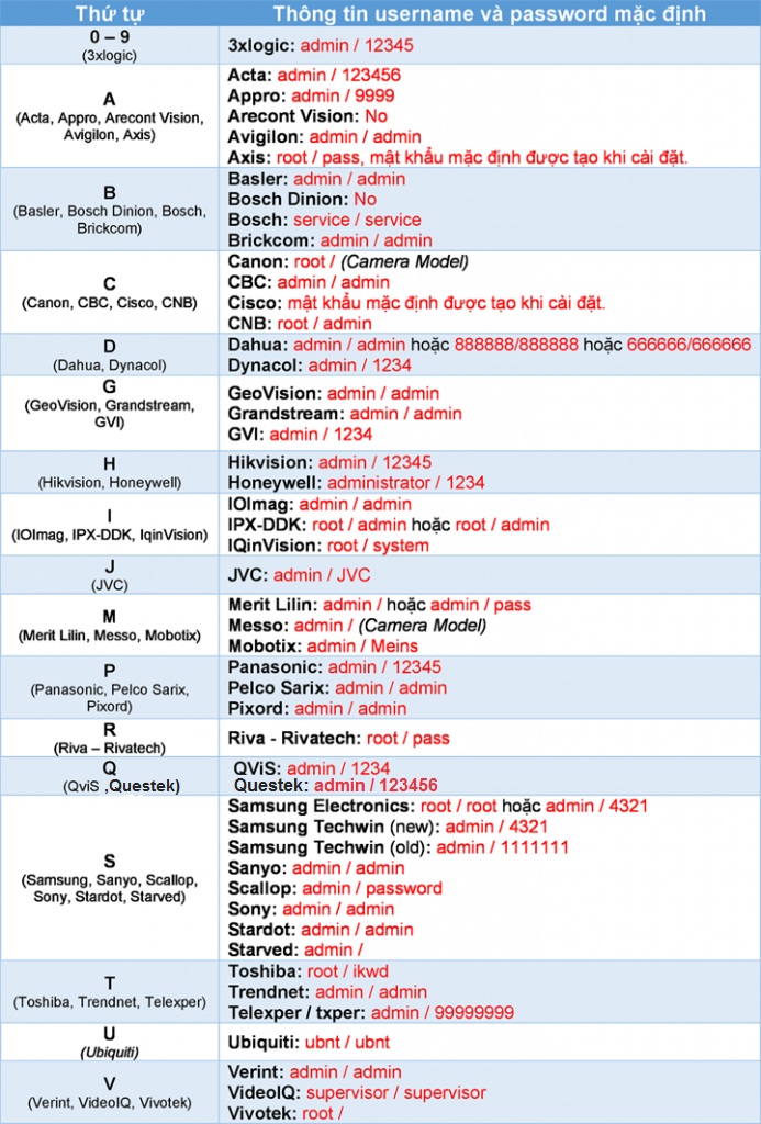Tổng hợp User và Pass mặc định camera đầu ghi và camera IP