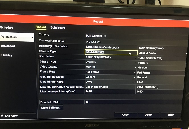 - Cài trên màn hình tivi các bạn vào Menu => Recoder => Parameters chọn Video&Audio và ấn Apply